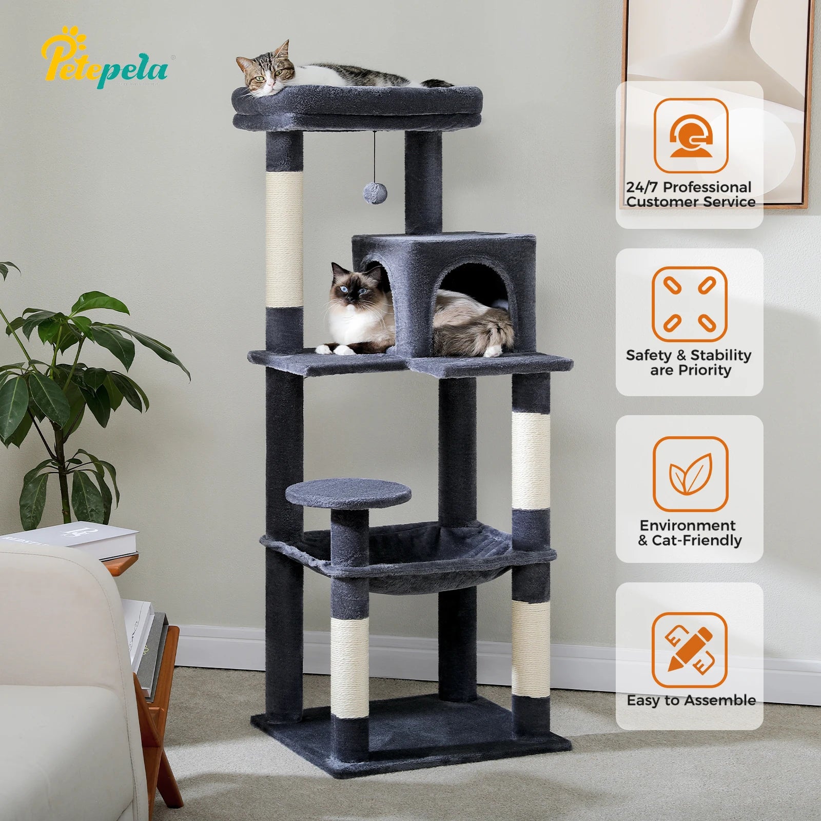 PETEPELACN Cat Tree Indoor Multi-Level Hammock Sisal Scratching Posts